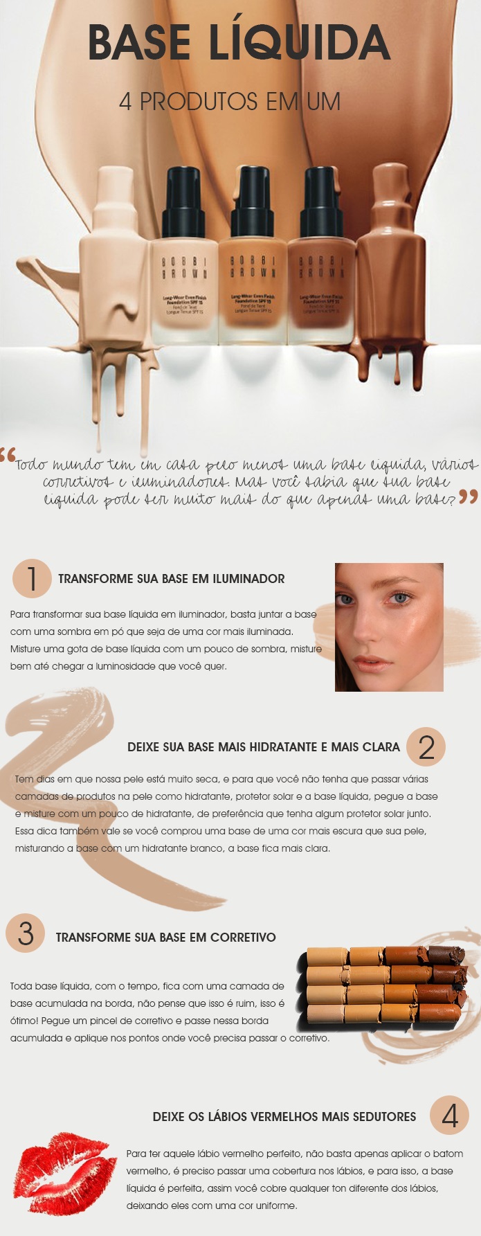Mas com essas dicas, além de viajar com menos produtos, você também não vai precisar comprar diversos produtos para ter um kit básico de maquiagem. Olha só tudo o que você pode fazer com apenas uma base líquida.