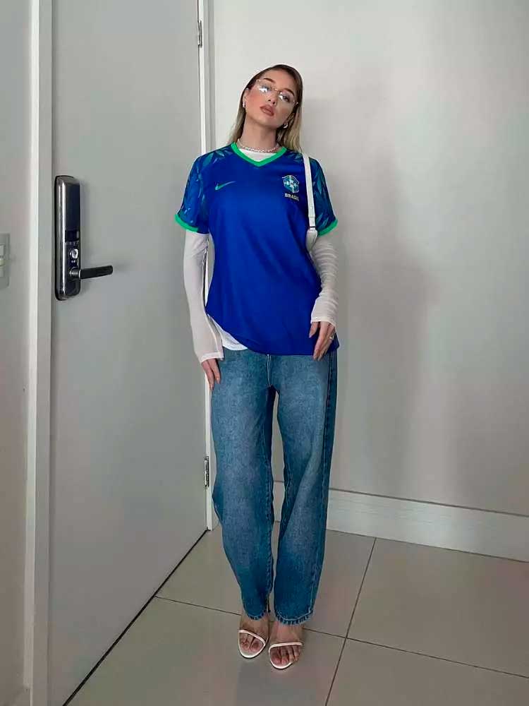 Uma das formas mais simples e estilosas de usar a camisa da seleção é combinando com jeans. Calças retas, mom jeans ou até shorts jeans criam um visual equilibrado e confortável. Para completar, tênis ou sandálias deixam o look leve e perfeito para o dia a dia.