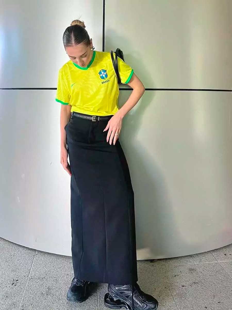 A camisa da seleção também pode ganhar um ar mais delicado quando combinada com saias. Modelos midi, plissados ou até minissaias criam um contraste interessante. Nos pés, sandálias ou tênis ajudam a adaptar o look para diferentes ocasiões.