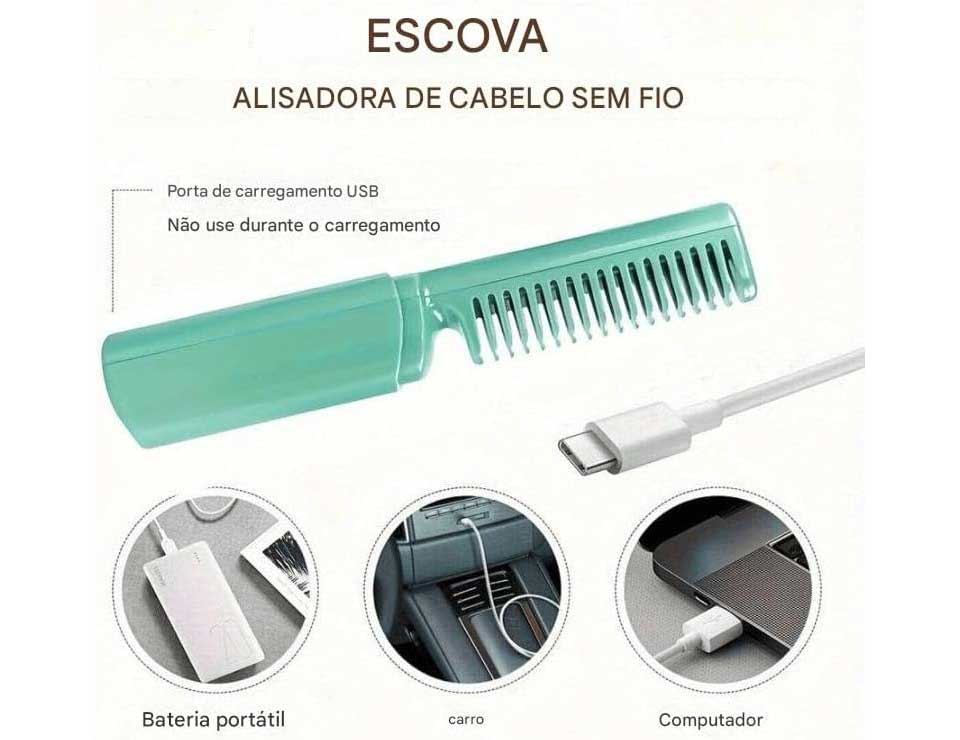 Se você procura uma escova alisadora que seja prática para levar em todos os lugares, essa é a sua escova. Ela carrega por um cabo UBS e você consegue usar tranquilamente e alisar e modelar seus cabelos com muito mais praticidade.