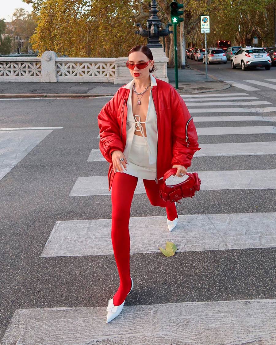 Outra opção é optar por um ‘look total’. Embora ela também acrescente alguma roupa branca, o tom dominante do look é o vermelho, com o casaco bomber e a bolsa a acompanharem as meias.