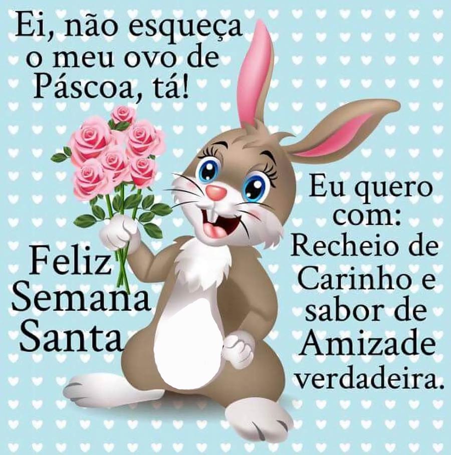 92. O coelhinho da Páscoa vai te trazer muita alegria, sorrisos e amor para sua vida, assim espero. Feliz Páscoa!