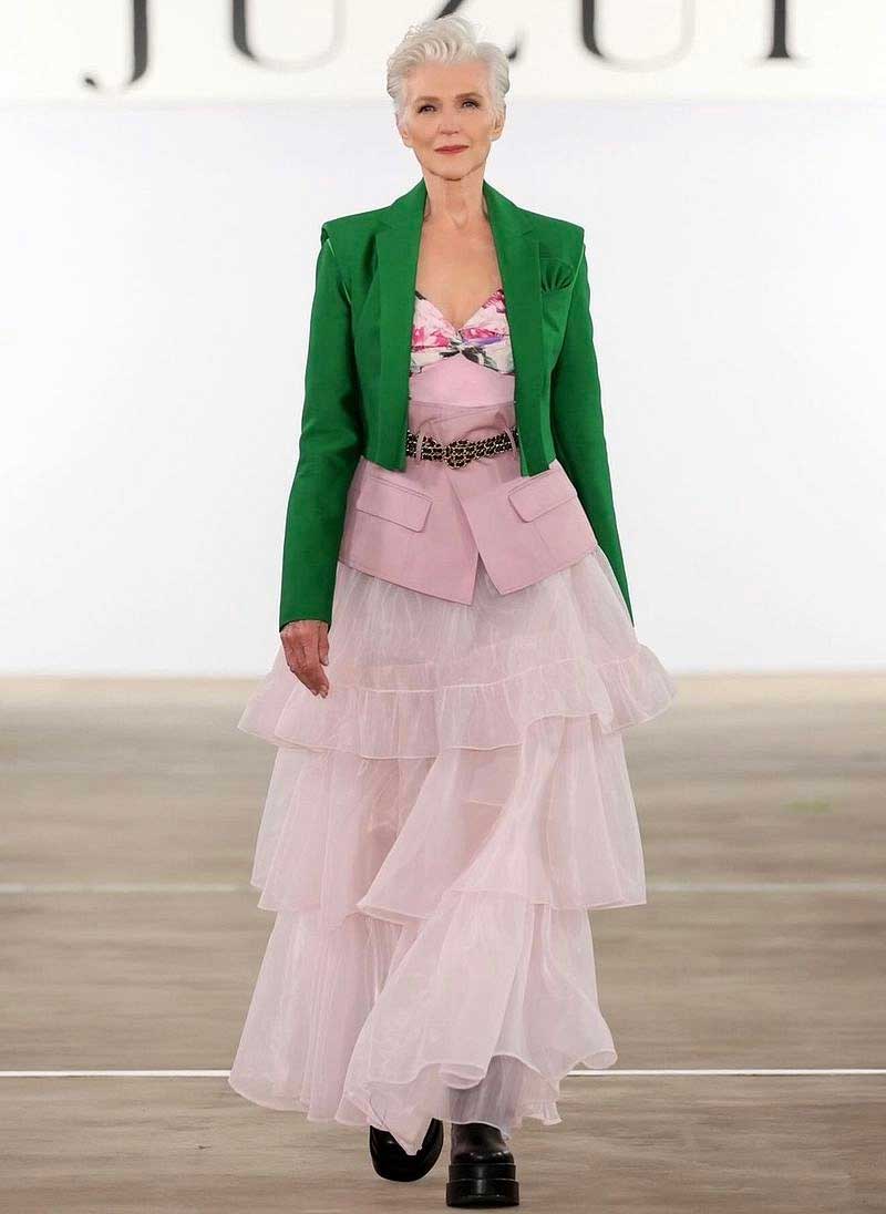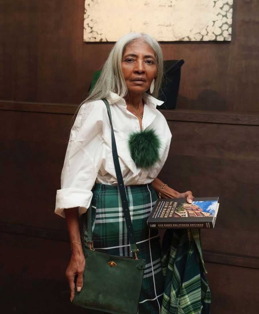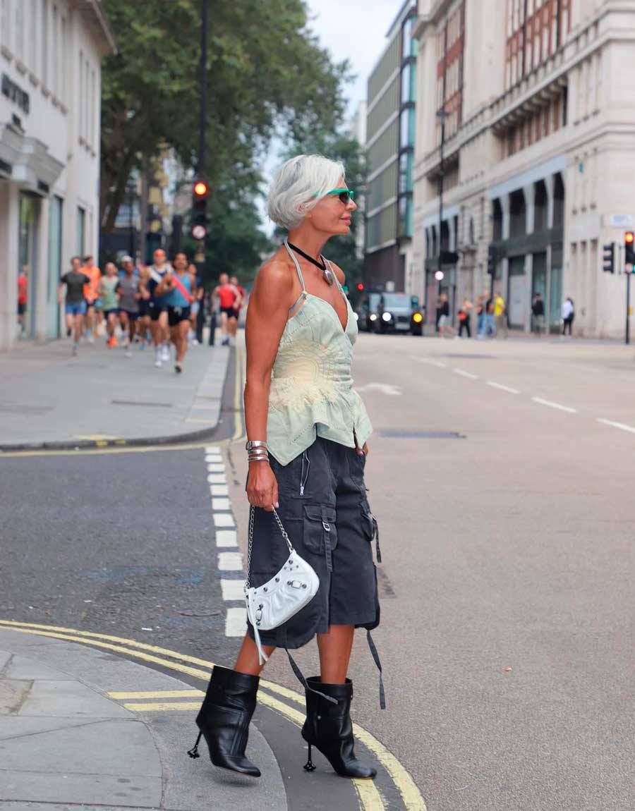 Criadora que combina tendências com identidade própria, destacando cabelos grisalhos e produções marcantes.