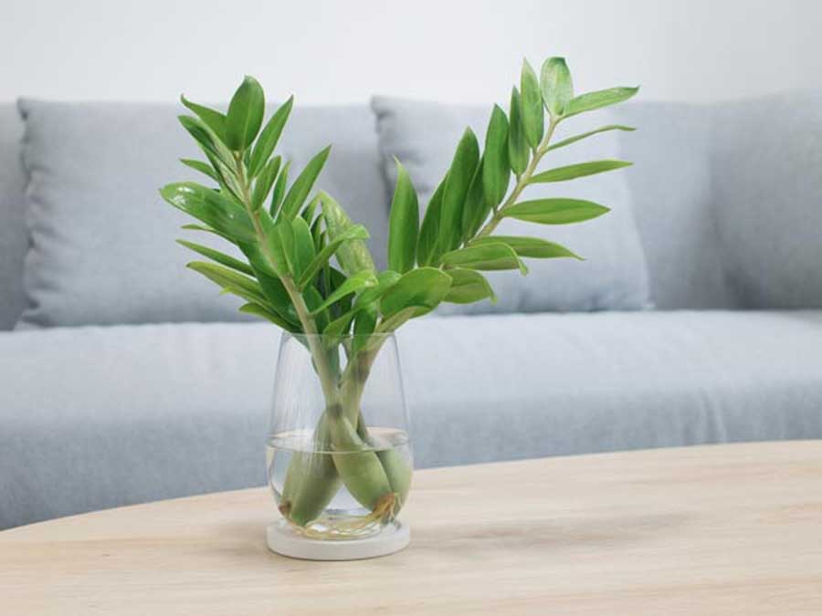 A zamioculca é uma planta que combina elegância com facilidade de cuidado. Para cultivá-la na água, corte um galho próximo à base e coloque em um vaso de vidro, cobrindo apenas parte do caule.