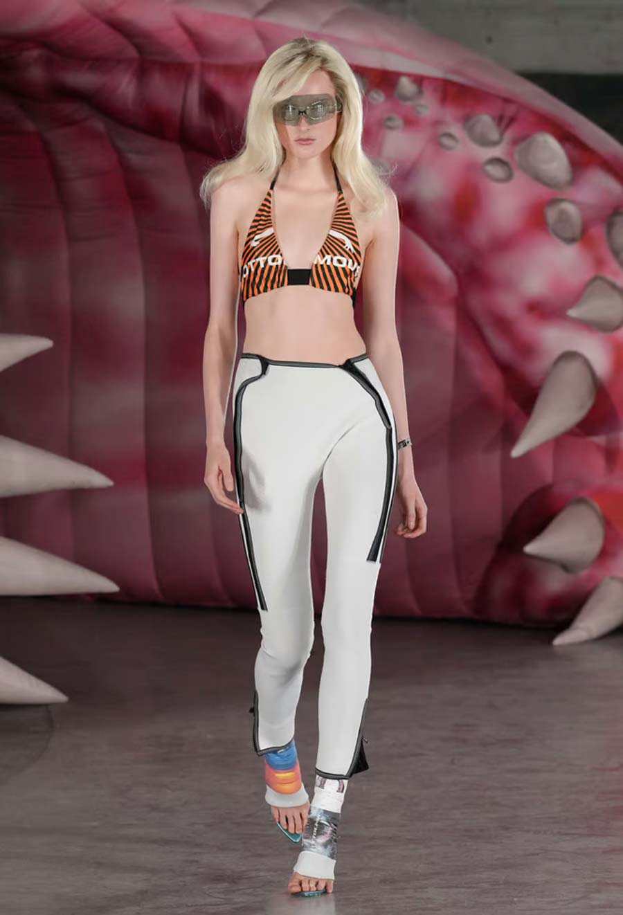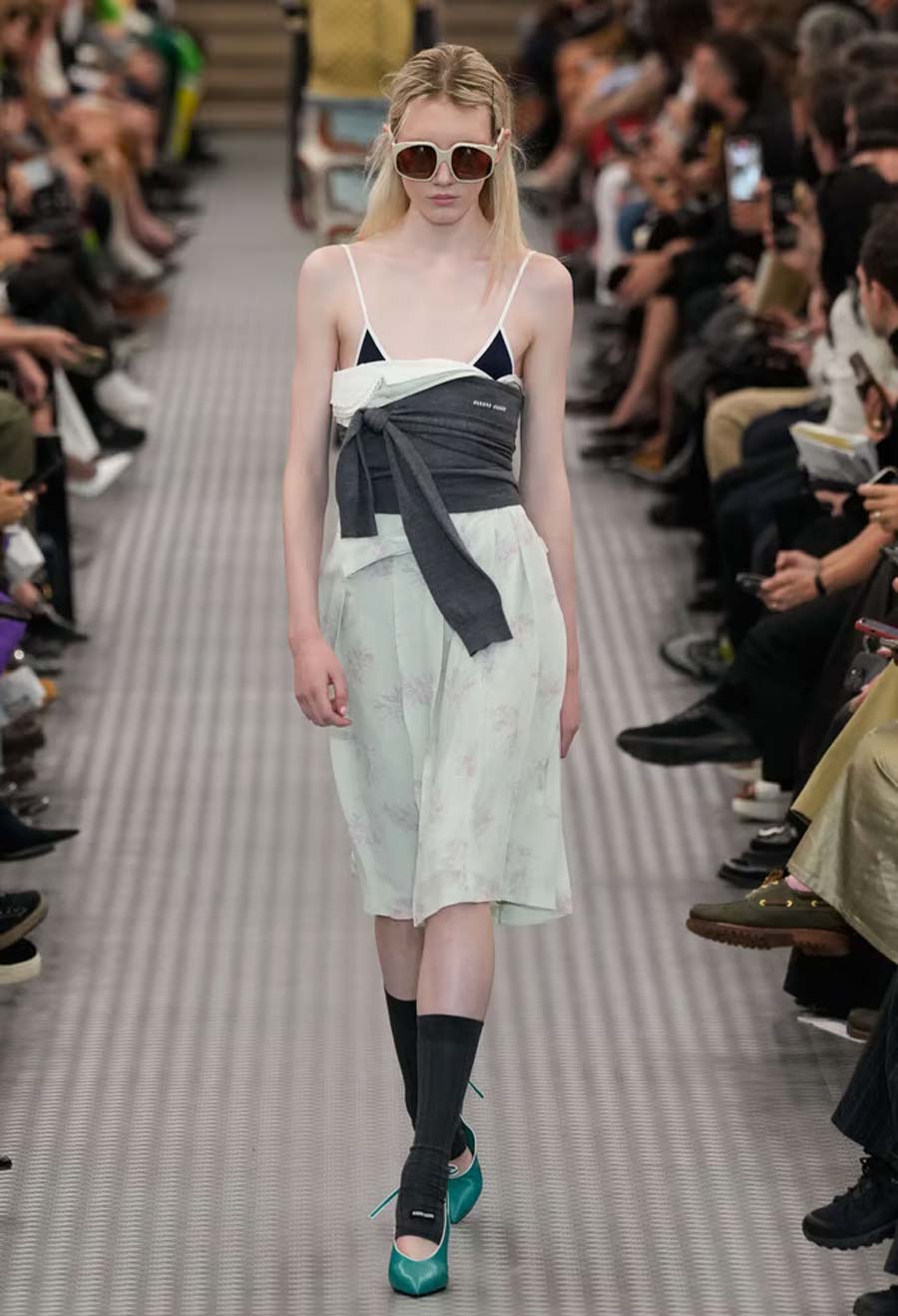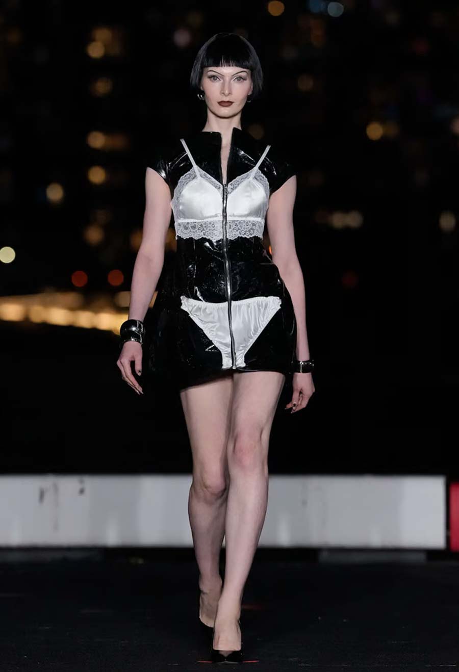 A lingerie continua como protagonista, invadindo o streetwear. Bodies, corsets e sutiãs são usados como peças principais, muitas vezes combinados com transparências. Designers brincam com a sensualidade através de bordados em látex ou efeitos trompe l’oeil. Suspensórios retornam como detalhes que realçam a feminilidade em versões modernas e ousadas.