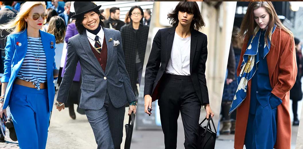 A moda masculina empresta elementos ousados ao guarda-roupa feminino. Ternos estruturados com ombros largos, calças amplas e blazers repaginados trazem de volta o espírito da working girl dos anos 80, mas com cortes mais soltos e detalhes contemporâneos. O colete se reinventa como top, enquanto blazers ganham versões sem mangas ou drapeados. A risca de giz, clássica, se mistura com vestidos leves, criando contrastes inesperados.