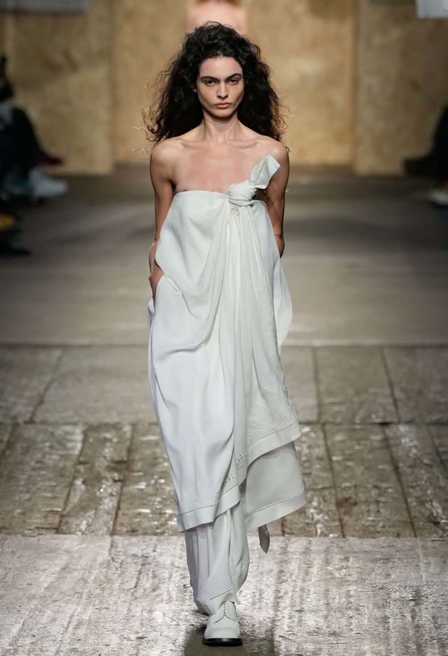 O branco puro ressurge como um símbolo de paz e simplicidade. De ternos clássicos a vestidos volumosos e camisas de noite em cetim, o tom domina as coleções. Vestidos brancos com drapeados inspirados na Grécia antiga e designs minimalistas também chamam a atenção, provando que o branco pode ser tudo, menos básico.