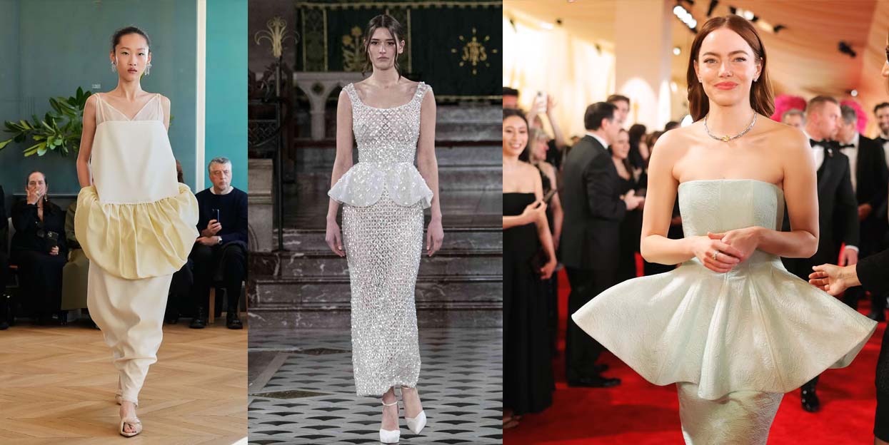 Os volumes localizados na cintura retornam com força, trazendo elegância vintage aos looks. Franzidos, sobreposições e peplums criam silhuetas sofisticadas, combinadas com fitas e cintos decorativos. O contraste entre quadris amplos e calças soltas adiciona um toque dramático e moderno.