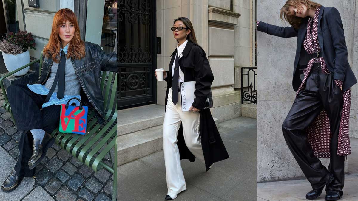 A moda masculina influencia diretamente os looks femininos em 2026. Gravatas voltam ao centro da cena, combinadas com blazers amplos, camisas de mangas volumosas, saias lápis e calças plissadas. O visual traduz força, elegância e uma feminilidade menos óbvia, mais alinhada ao poder e à individualidade.