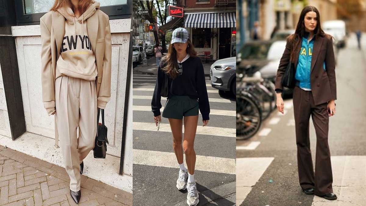 A estética esportiva segue firme, mas agora dialoga com peças elegantes. Em 2026, o sportswear aparece combinado a alfaiataria e itens clássicos. Pense em jaquetas esportivas usadas com blazers estruturados, polos vintage ao lado de saias de couro e calças amplas equilibrando conforto e sofisticação. O resultado é um visual urbano, atual e cheio de informação de moda.