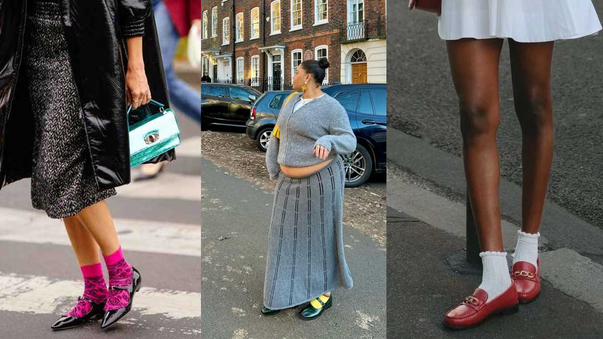 Antes discretas, as meias assumem papel central nos looks de 2026. Elas aparecem à mostra com scarpins, mocassins, sandálias, tênis e sapatilhas. Tons vibrantes como vermelho, versões estampadas ou com acabamentos diferenciados transformam o acessório em ponto focal da produção. Um detalhe simples que faz toda a diferença.