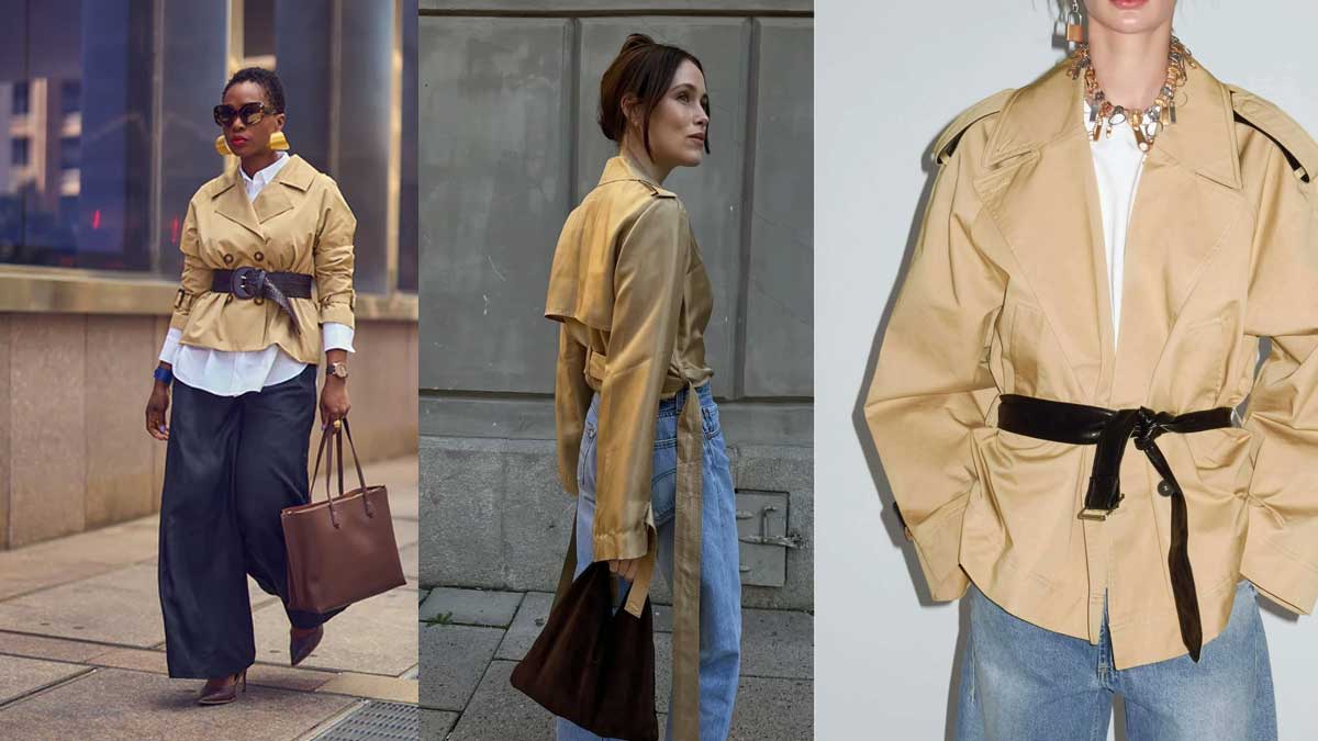 O trench coat segue como peça essencial, mas longe do óbvio. Em 2026, ele surge com cortes cropped, mangas volumosas, golas altas, cinturas marcadas por cintos sobrepostos e até efeito capa. A tradicional versão bege se reinventa e se torna um elemento de impacto capaz de atualizar qualquer look de meia estação.