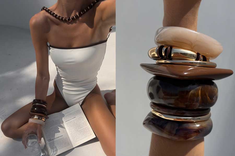 Os acessórios também ganham destaque. Braceletes de acetato coloridos e geométricos trazem personalidade e um ar moderno às produções minimalistas. São peças que transformam qualquer look em questão de segundos.
